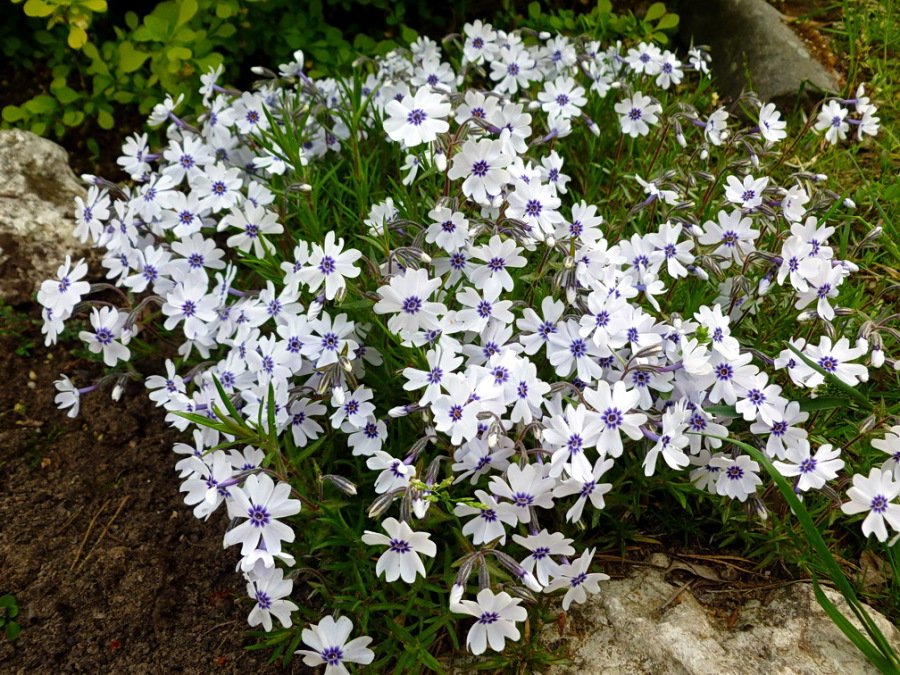 Флокс сорта Bavaria (Бавариа) благодаря необычному внешнему виду часто используется для оформления альпинариев, миксбордеров и рабаток. Этот сорт обладает стелющимися побегами с густой листвой. С наступлением весны растение обильно покрывается цветами. Они белые с сиреневым центром. Достигают 2,5 см в диаметре и имеют легкий едва уловимый, но приятный аромат. Взрослое растение не превышает 10 см в высоту и цветет в мае и июне. В августе иногда происходит повторное цветение. Флокс хорошо переносит морозы и будет отлично чувствовать себя в песчаной влажной почве с хорошим дренажем. Растение выглядит намного интереснее при посадке на солнечный участок.