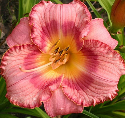 • Окраска цветка : Лососево-розовый, с ярко-розовым кольцом и каймой и с жёлтым центром
