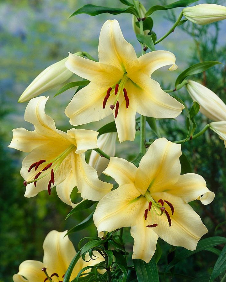Лилия от-гибрид Ханимун - это настоящая находка для цветоводов, желающих создать в своем саду уютный уголок солнечного счастья. Это растение поражает своей изысканной красотой и неповторимым ароматом. Стебель лилии от-гибрид Ханимун прочный и устойчивый, достигая высоты до 90 см. Ее листья имеют элегантную форму, а цветки медового оттенка с нежно-желтым отливом радуют глаз в течение 2-4 недель.