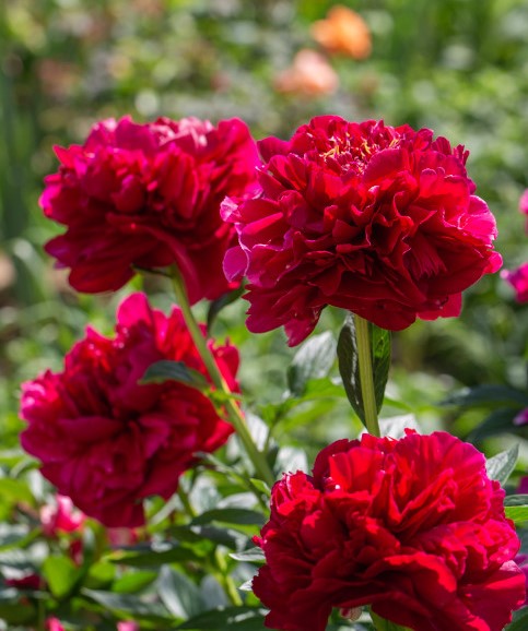 - Пионы используются для посадки многолетних клумб или создания групп растений. Они хорошо сочетаются с лилейниками, астрами или другими луковичными растениями.