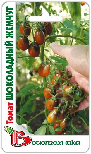 Семена томата "Шоколадный жемчуг" (Shokoladnyj zhemchug) – сорт, который практически не поражается фитофторозом и другими распространенными грибковыми заболеваниями. На коротких кистях созревает около 18-12 плодов. Помидорки начинают созревать через 110-115 дней после появления первых всходов. Плоды грушевидной формы, миниатюрные, массой до 15-20 грамм, шоколадного цвета, блестящие, плотные. Вкус десертный, очень нежный. Собранный урожай можно хранить без потери товарных качеств примерно 1,5-2 месяца. Используют плоды в свежем виде и для цельноплодного консервирования.